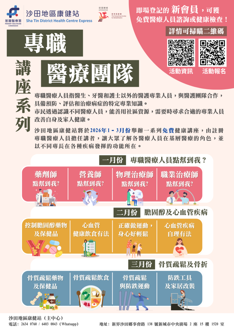 想了解專職醫療團隊如何幫助您和家人改善健康? 沙田區康健站將於 2026年 1至3月 按不同主題舉辦一系列專職醫療講座,由專職醫療人員包括藥劑師、營養師、物理治療師及職業治療師,為您解答常見健康問題及親自講解實用健康知識!