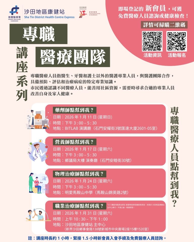 沙田區康健站將於 2026年 1月 舉辦一系列專職醫療講座,講解藥劑師、營養師、物理治療師及職業治療師的職能,並解答常見健康問題!