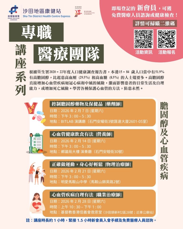 沙田區康健站將於 2026年 2 月 舉辦一系列膽固醇及心血管疾病講座,從藥物、飲食、運動及家居自理方面預防及控制疾病!
