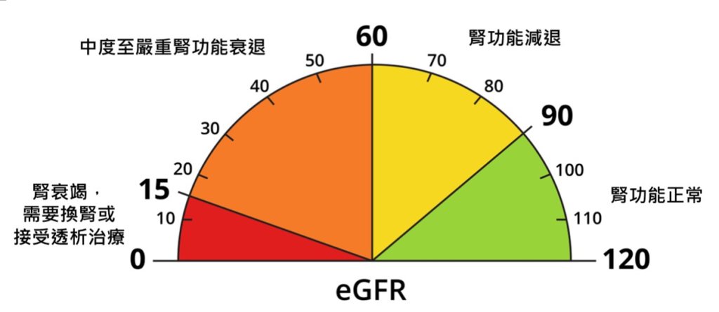 另外,運用以上原理,醫護人員可以透過方程式估算腎小球過濾率(estimated glomerular filtration rate,eGFR,即醫生會診吿訴病人腎臟功能尚餘的百分比),可以參考下圖: