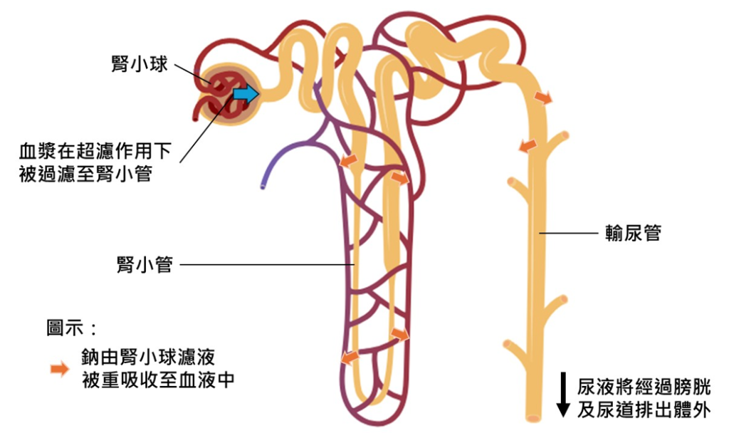 血液會經腎動脈進入腎臟,並流入不同的腎小球(由微絲血管捲曲而成的球體,被腎小管的鮑曼氏囊所包圍)內。腎小球中的血漿在血壓促使下會被過濾至鮑曼氏囊(即超濾作用),然後進入腎小管,成為腎小球濾液。腎小球濾液沿着腎小管前進,鈉和部份水份會在過程中被重吸收至血液中。餘下未被重吸收至血液中的腎小球濾液最後會變成尿液,經過膀胱和尿道排泄出體外。