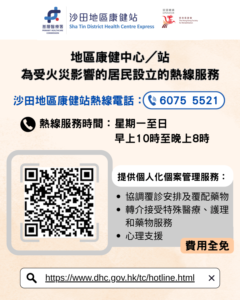【地區康健中心/站為受火災影響的居民設立的熱線服務】